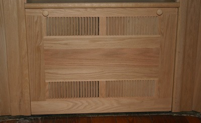 I completed all the woodwork on the bay window unit today. I won’t play conquering hero either. With the weird angles and different depths of the windows, the embedded convection steam radiator, and more than a couple of measure-once goofs, I was very lucky to get through this without a major screwup. This weekend, I completed and installed that removable grill in the center of the windows. This was also a bit of work. There are seven boards and two store-bought but modified red oak grills in that face panel, all of them biscuited together with waterproof glue. I wanted