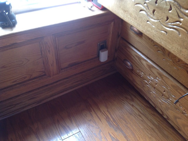 Kitchen vent soffit which will handle a CAT6 cable pull to the basement, then up to the living room entertainment cabinet and an 8 port switch. I’ll probably pull 3 cables here, one for the basement too and a spare. I’ll probably have to open a 4″x4″ hole in the soffit for the fish tape. The computers and router are just to the left in this photo. T