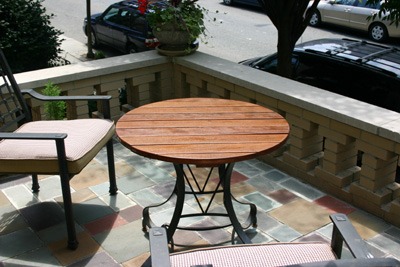 Karen found the wrought iron base in one of her dumpster dives and gave it to me. I picked up some ipe at Dykes and made the top. Unfortunately, I found that ipe and marine urethane don’t play well together. Maybe it’s the oils in the wood, maybe it’s because I sanded it down to too fine a grit, but it was all flaking off.
