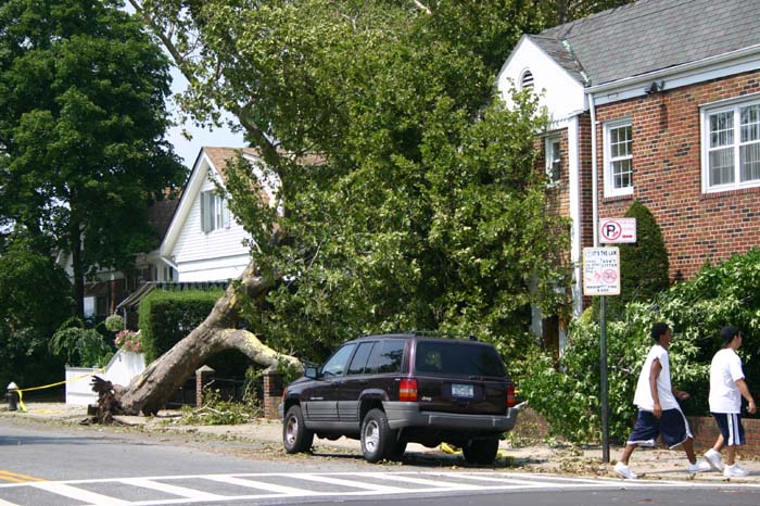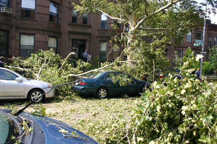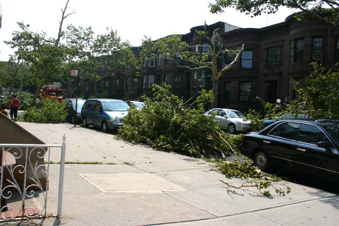 This is Shore Road, where the tornado made its initial land fall. It’s still not certain where the tornado formed. Speculation is that it started as a mild F0, dancing across Staten Island. Then it gained strength as a water spout in NY harbor, which is visible beyond the trees in this shot. The destruction on Shore Road and neighboring Narrows Blvd was among the worst in Brooklyn. Cops shut down streets with heavy structural damage so my pics are mostly foliage shots. Almost every block in the lower 70s from Shore Road to Third Ave had a scene like this.