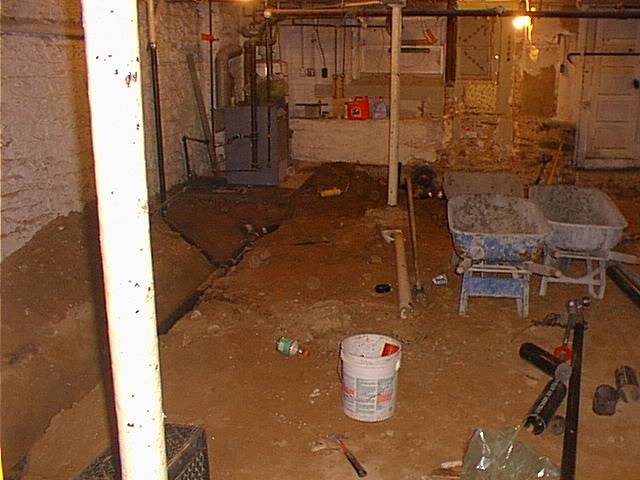 Since this was the perfect time to replace the hundred year-old plumbing, trenches were dug and new no-hub was run and plumbing roughed in for a downstairs bath. It was easy work for me because I left these two jobs to licensed contractors. Hey, I pick my battles.
