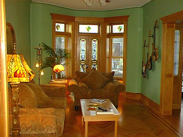 You can also use compound mouldings and casings in your pediments and baseboards. Here’s an example in the living room, both the windows and the door to the front deck: