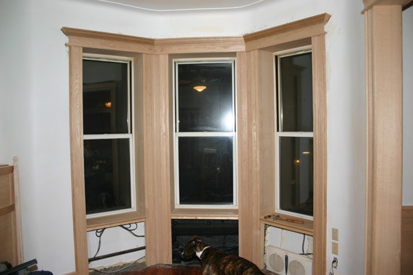I usually prefab the moulding details over doors and windows on a table then slip them into place. By the way, the woodwork is all red oak. It’s all different colors because some of it has been sanded to 220, some of it’s still raw and some of it is 100+ years old. Since it’s all going to be sealed and stained it should all blend pretty well in the end.