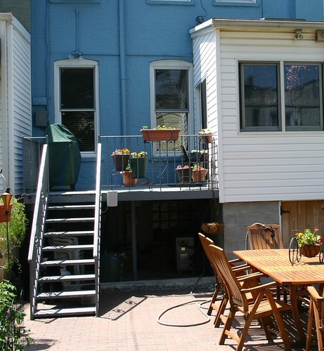Far less impressive however was the paint job I did on my back deck. With my new, blue wall I wanted something other than a black steel deck. So I went to my local Home Depot and had a custom light gray Rustoleum mixed for me. After I pressure washed and wire brushed the deck, I laid down a coat of rusty metal Rustoleum primer. Because of the ornate metal railings, it was a lot of work with a 2″ brush but it looked great.