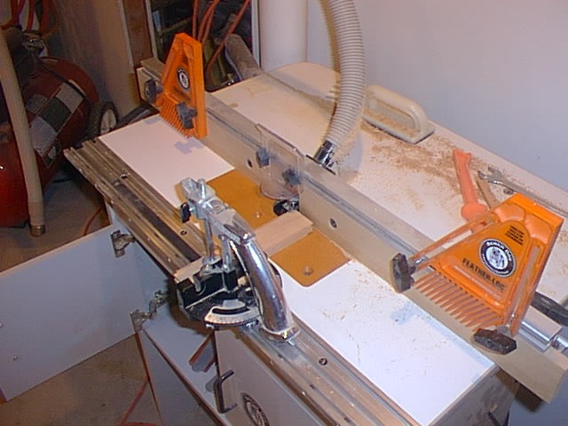 I’m using the ‘B’ bit to cut the rail so it mates with the exposed ‘A’ cutter profile. The trick here is that you’re cutting end grain which has a tendency to split out. You would normally back the rail with a sacrificial piece of scrap lumber to prevent tear-outs. Instead, I did this cut in several passes, which worked well enough. It’s critical that the fence and guide be perfectly square and that the roller bearing on the bit is flush with the fence. The hardest part is getting the “B” profile bit to match the “A” profile’s depth. You go through a lot of scrap lumber when setting up the bits so it’s best to plan the cuts as a production line.