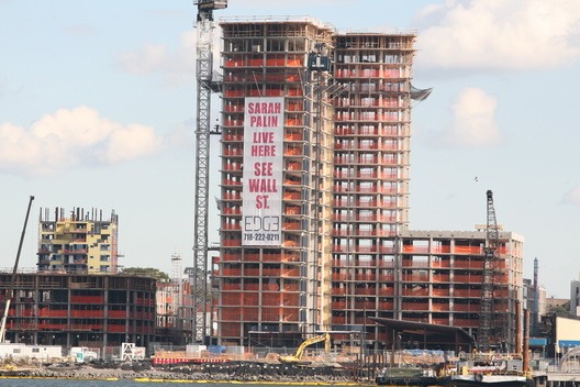 The media’s fascination with Sarah Palin continues. My friend saw this from the ferry a couple of days ago. It’s a new building being constructed in Williamsburg, Brooklyn.