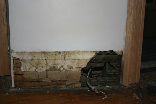 What’s baffling is why the house also has ancient metal air ducting buried inside the walls. I discovered this shortly after I moved here when I ripped down the basement ceiling and found three vertical ducts to nowhere. Over the past hundred years, various plumbers and electricians had used them for service pulls. So did I when I ran 3/4″ copper to the second floor bath, the central vac piping and various electrical branches from the basement panel.