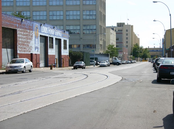 These are the First Avenue tracks which trains must take to get from the 65th rail yard to the NYCH rail yard about about a half mile north. The tracks, which are still in use, take trains through the Brooklyn Army Terminal, which you can see in the distance. Many of the old factories on First Avenue built spurs for their own freight. For industry, these trains were the UPS of its day.