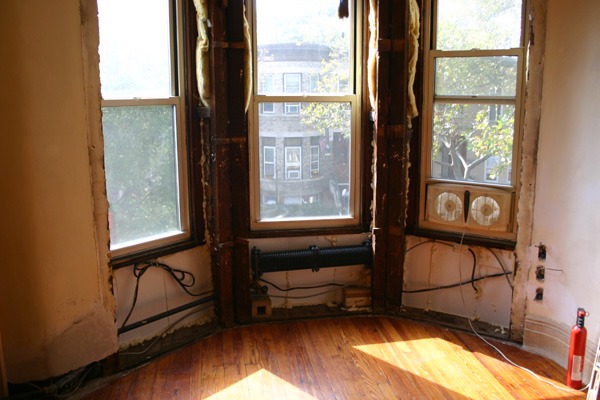 - shoved insulation into the walls where I could and sprayed foam insulation in gaps around the window frames,